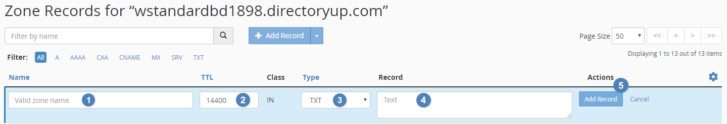 5. Click in the arrow next to the "+ Add Record" button, then click on "Add TXT Record":