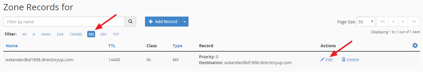11. Go back to the "Zone Editor" in cPanel >> Click on "Manage" >> Click on the "MX" option and then click on "Edit" for the existing MX Record: