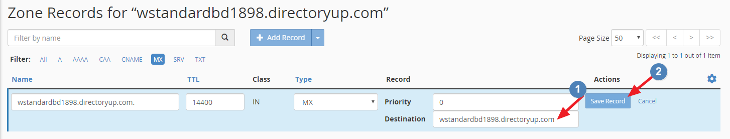 12.Replace the content of the "Destination" field with the "Points to address or value" for the "MX Record" value obtained from your Office 365 account in step 10 above.